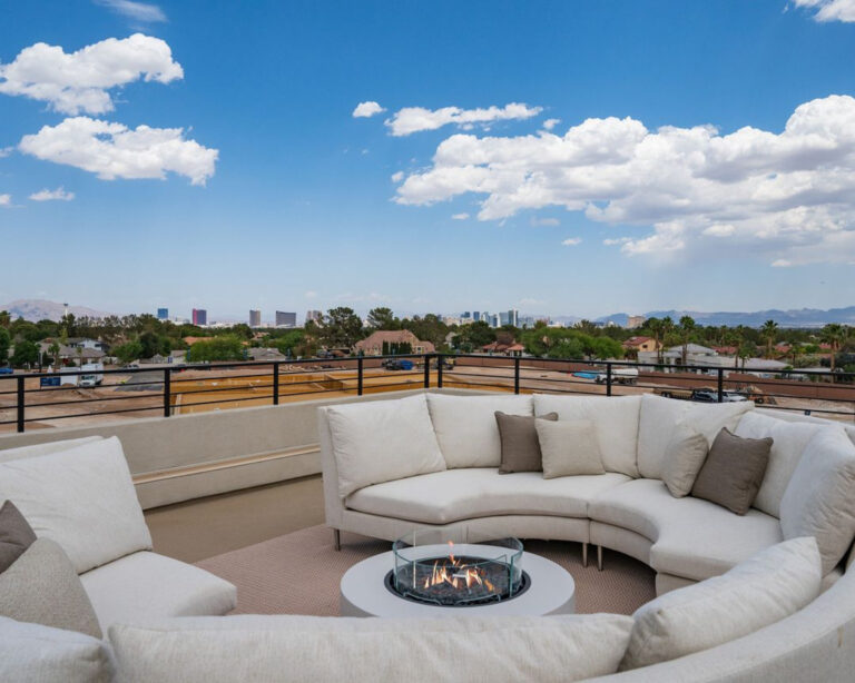 The Home’s sky deck delivers sweeping vistas of the Las Vegas valley and the vibrant strip. A spacious outdoor sofa, complemented by a fire table, creates an ideal setting for hosting gatherings and appreciating the scenic views.Blue Heron.